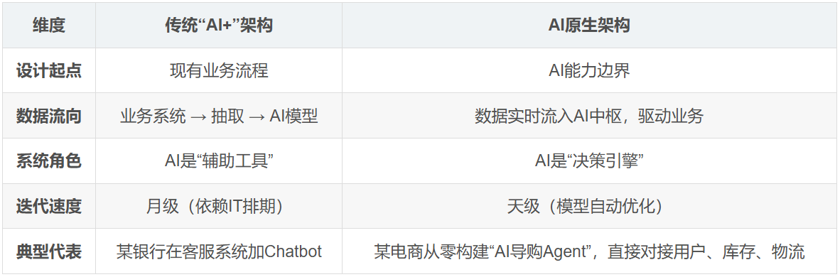 如果说“AI ”是在现有系统上“打补丁”或“外挂”AI功能,那么AI原生则意味着以AI为系统设计的底层逻辑与能力中枢,这套系统为AI而生、因AI而长,驱动从技术架构、业务流程、组织角色到价值创造方式的全方位重塑。