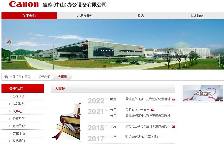 在佳能(中山)办公设备有限公司官网上,公司大事记还记录着2022年“累计生产1亿1000万台”的字眼。2022年之后,大事记就再也没有更新过。