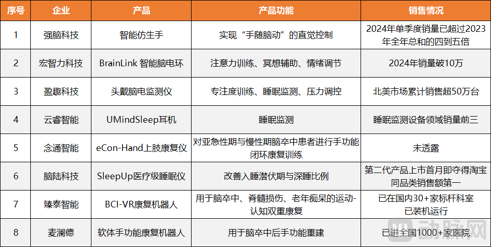 以强脑科技推出的智能仿生手为例,这是国内最早走向市场的非侵入式脑机接口产品之一,于2020年正式推出并实现量产。根据最新数据显示,智能仿生手2024年单季度销量已超过2023年全年总和的四到五倍,正处于市场快速扩张阶段,其市场定价为3-5万元,按此测算,智能仿生手至少为强脑科技带来了千万元级别的收入。另外,除了智能仿生手,强脑科技还拥有深海豚(Easleep)脑机智能安睡仪、FocusZen(舒压/专注力)脑环等多款产品,并且当前都已获得不错的市场收入。