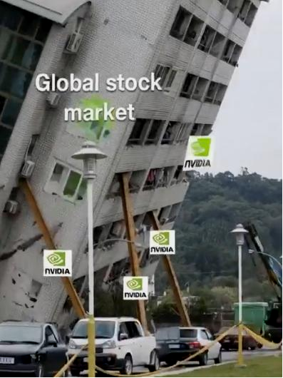 在内部会议上,黄仁勋提到一个网络梗图,几根绝望的杆子苦苦支撑一栋倾斜严重的大楼,大楼是“全球股市”,杆子全是“英伟达”。