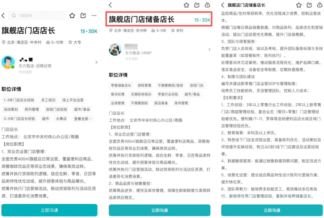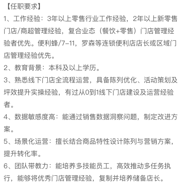 招聘启事显示,东方甄选对店长的要求尤为苛刻,不仅需要5年以上零售行业经验、3年以上新零售门店管理经验,还特别强调“餐饮 零售”复合业态管理背景,优先考虑便利蜂、7-ELEVEn、罗森等品牌的从业者。显然,东方甄选迫切希望借助成熟人才快速搭建运营体系,以弥补自身在线下运营经验上的短板。