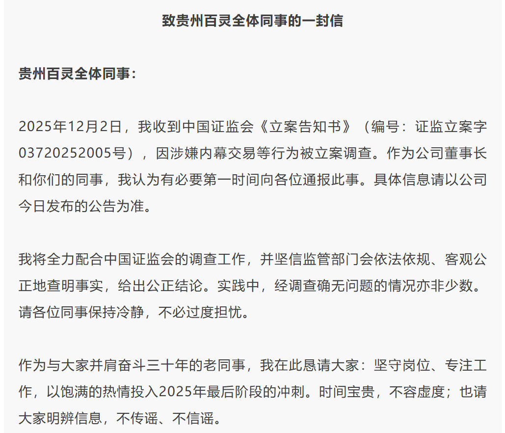 同日晚间,贵州百灵官微发布了姜伟“致贵州百灵全体同事的一封信”。除通报自己被立案调查一事外,姜伟还提及,最近几年,贵州百灵及其个人非议不断。2024年上半年,公司股票被ST,2025年摘帽后,其作为公司控股股东遭到华创证券无理巨额起诉,如今又受到中国证监会的立案调查。“这一切都让我有一个强烈的感觉:似乎矛头开始转向了我个人。”