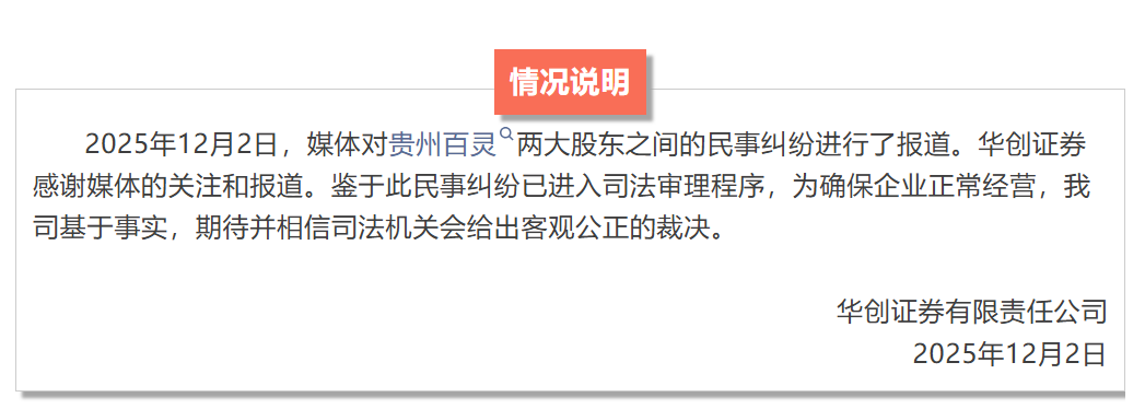 12月2日晚间,华创证券在官微发文称,鉴于此民事纠纷已进入司法审理程序,为确保企业正常经营,我司基于事实,期待并相信司法机关会给出客观公正的裁决。