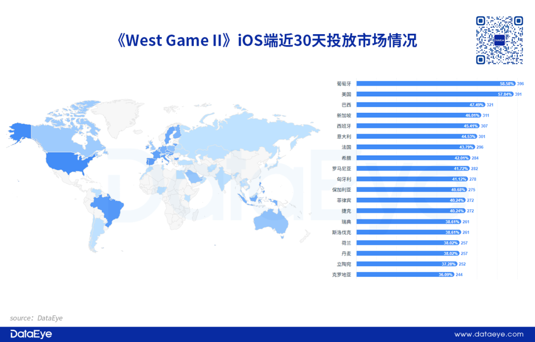 具体来看,《West Game II》iOS端近30天投放市场/地区TOP5为葡萄牙、美国、巴西、新加坡以及西班牙。