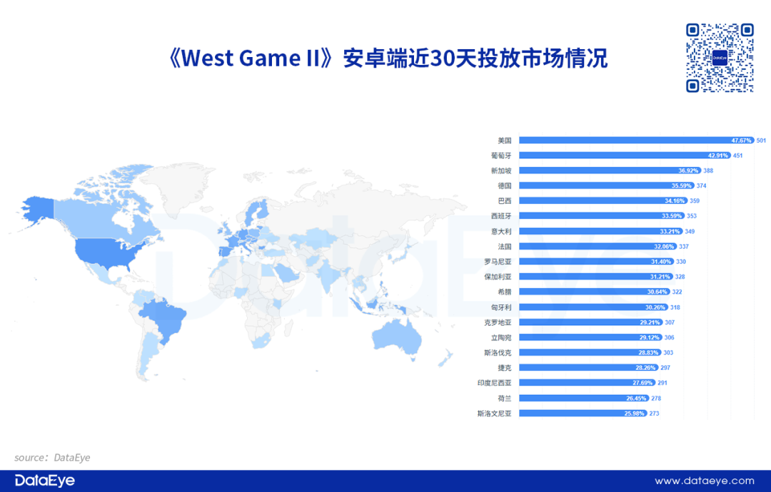 而《West Game II》安卓端近30天美国地区投放占比最高,其次是葡萄牙,新加坡排名第三位。