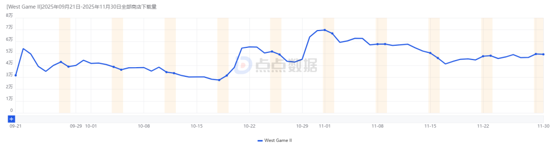 截至11月30日,《West Game II》上线以来双端累计预估收入接近200万美元,约合人民币1400万元。从预估收入趋势来看,《West Game II》收入数据呈现持续攀升的态势。