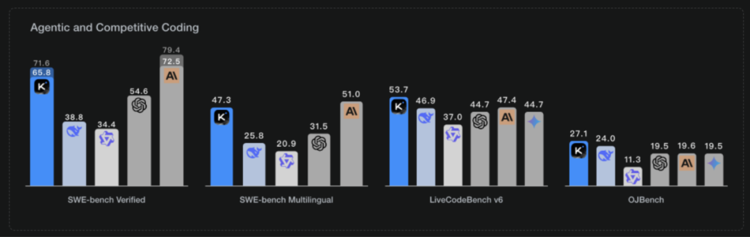 事实上,Kimi K2模型在成本上也很有优势。11月,月之暗面发布了最新的开源巨模型Kimi K2 Thinking,其在推理、编码能力的测试上依然保持领先。