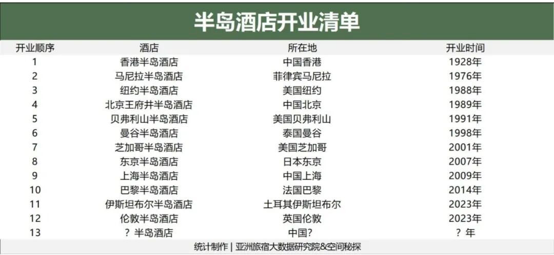 自1866年在上海起源以来,半岛便仅在顶级都市开设顶奢酒店,发展至今近百年时间,旗下也仅有12家半岛遍布于全球顶级城市,在这之中香港、东京、曼谷、伦敦、纽约与芝加哥分号完全归其母公司所有,其余则持有42%至77.4%的股份。