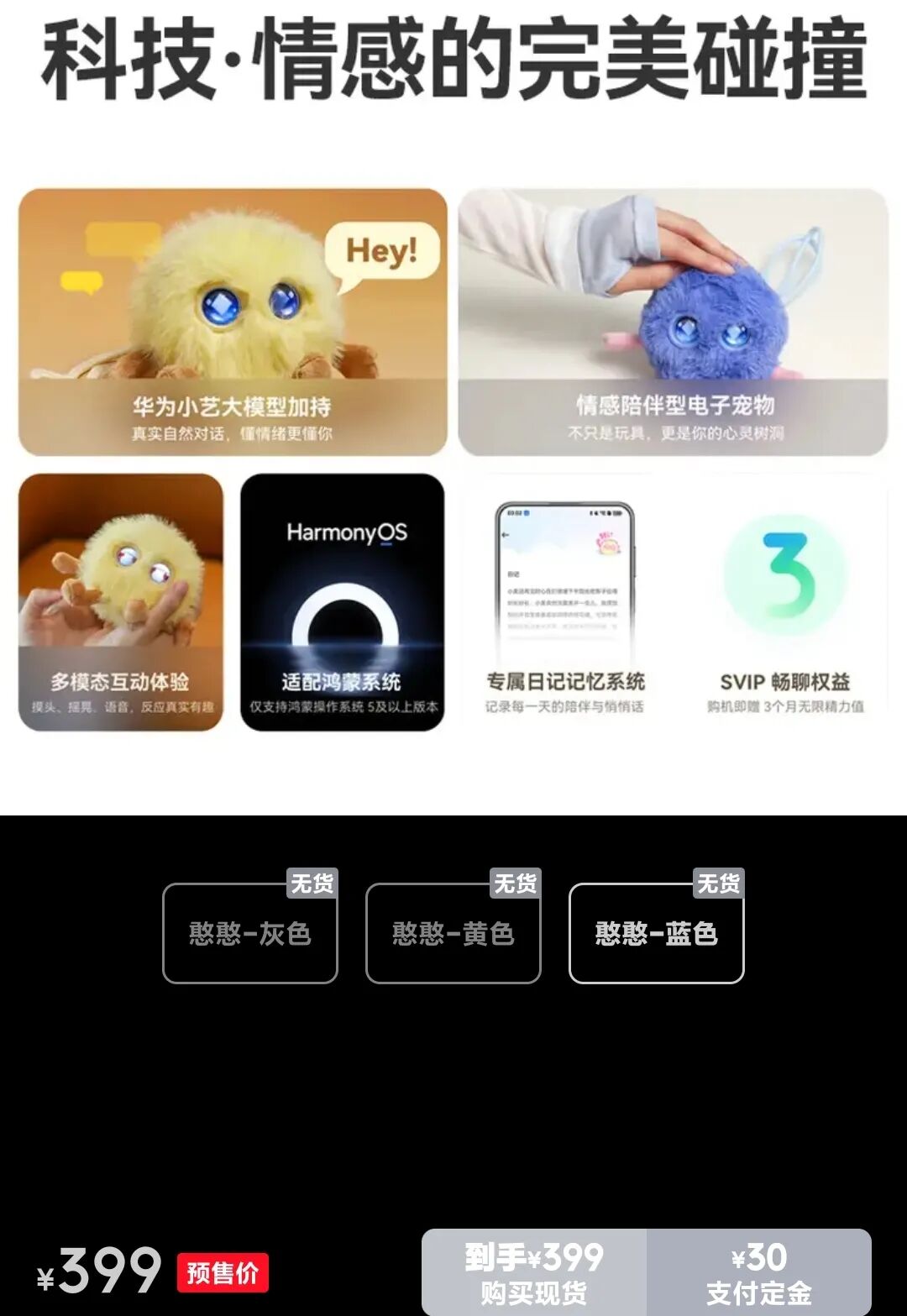 11月28日,华为新品情感陪聊AI“智能憨憨”以399元的价格开售,当日开售就秒空,直接引爆全网,京东自营旗舰店三款配色累计销量迅速突破6500件,补货多次也。