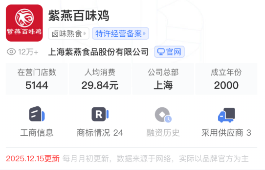 然而,近年来,紫燕食品“快速开店,抢占市场”的策略似乎逐渐失效。窄门餐眼数据显示,截至今年12月15日,紫燕食品的门店数量已经萎缩至5144家。