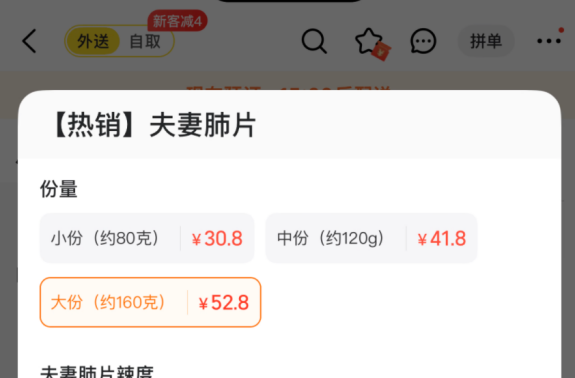 12月26日,雷达财经通过某外卖平台了解到,在紫燕的一家线上外卖店中,一份160克的夫妻肺片原价为52.8元,按此计算,其每斤价格再次上涨,达到165元。