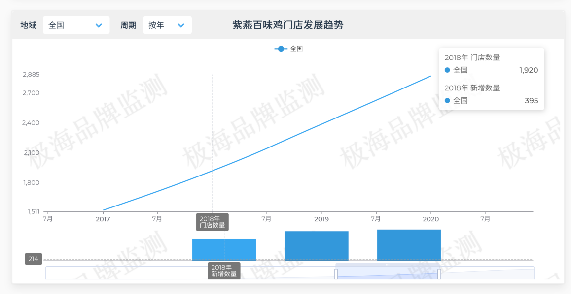 凭借着这种经销模式,紫燕食品一度实现迅猛扩张。极海品牌监测数据显示,2018年,紫燕门店数量尚不足2000家。而据公司官网披露数据,到2023年末,紫燕门店数量在短短几年时间内已攀升至6205家。