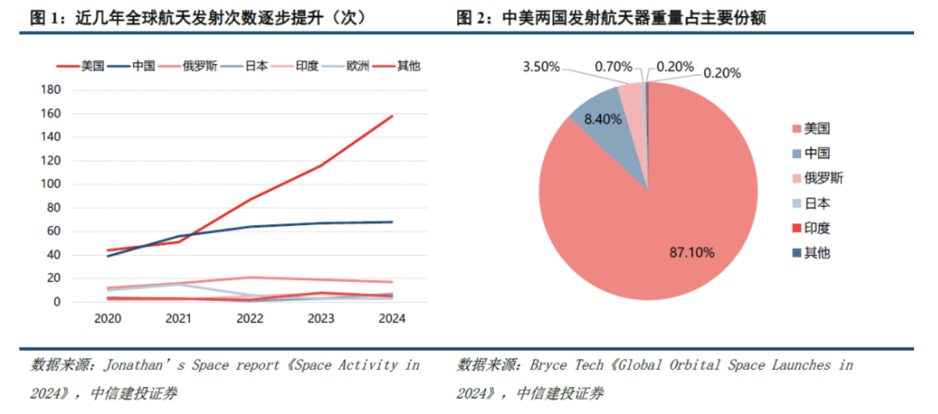 东吴证券研究所数据显示,2024年,全球轨道级发射总计261发,有效荷载2707个,其中SpaceX共发射2374个,占比87.7%。2025年,SpaceX发射提速,截至11月23日,已完成151次任务,计划全年发射170次,去年全年SpaceX共执行134次轨道发射任务。