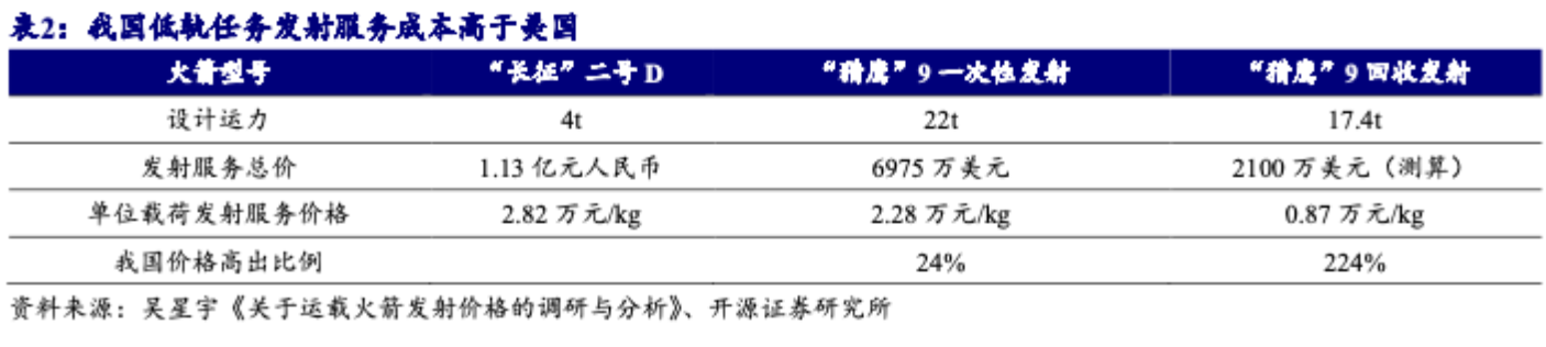 据蓝箭航天前CFO吴星宇发布的《关于运载火箭发射价格的调研与分析》,SpaceX猎鹰9号火箭回收发射的单位载荷发射服务价格约0.87万元/kg,而长征二号D火箭一次性发射的单位载荷发射服务价格约2.82万元/kg。该数据直观体现国内与国际商业航天头部企业的发射成本差距。