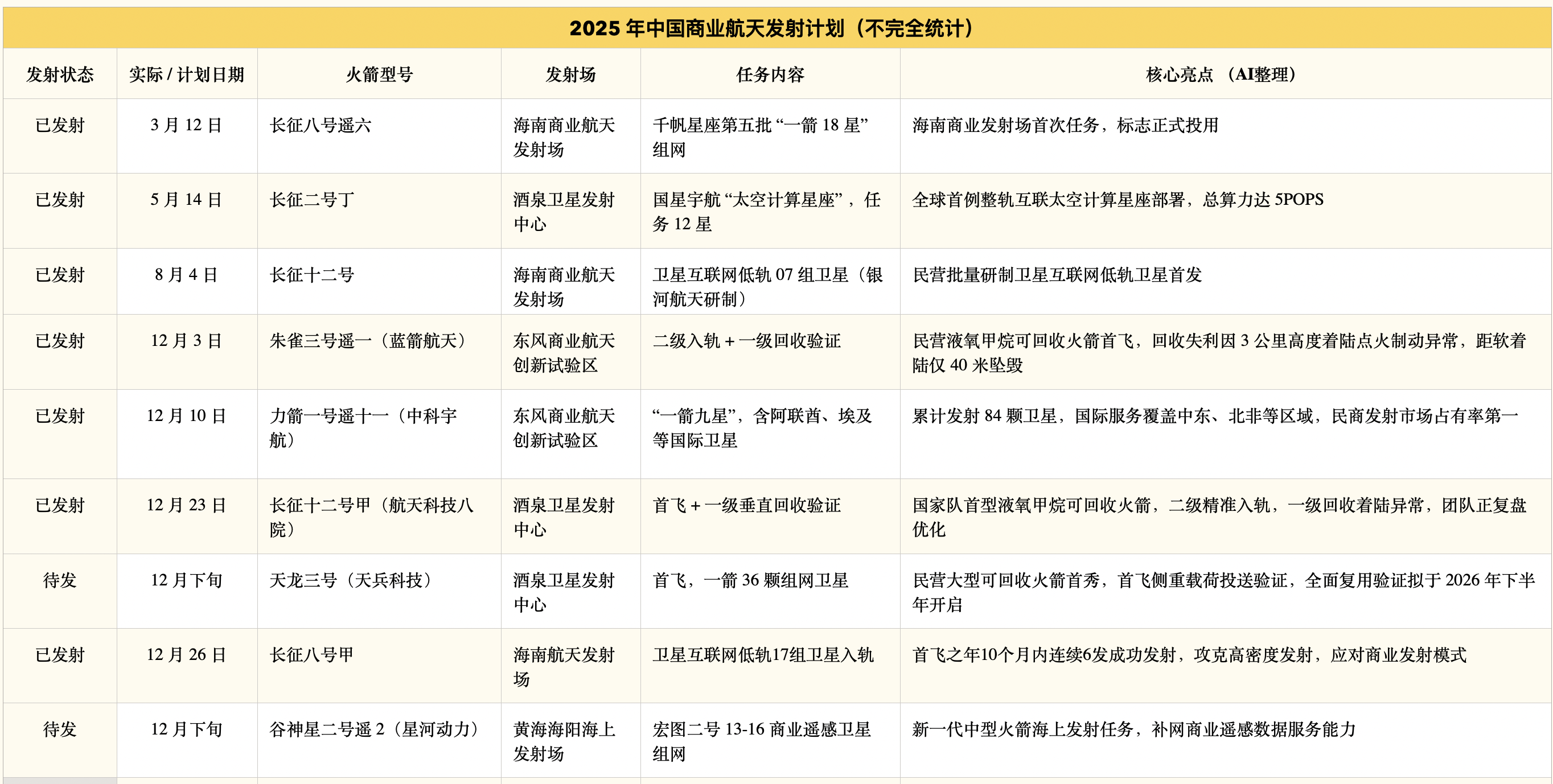 2025年,国内商业航天企业迎来首个密集发射期,多款国产商业火箭规划年底首飞,是观察本土企业可回收火箭技术验证的年度“重头戏”。