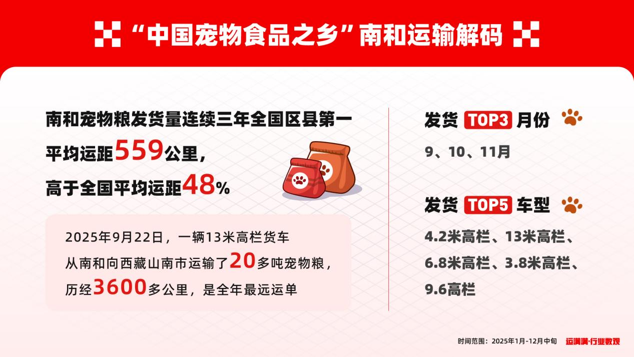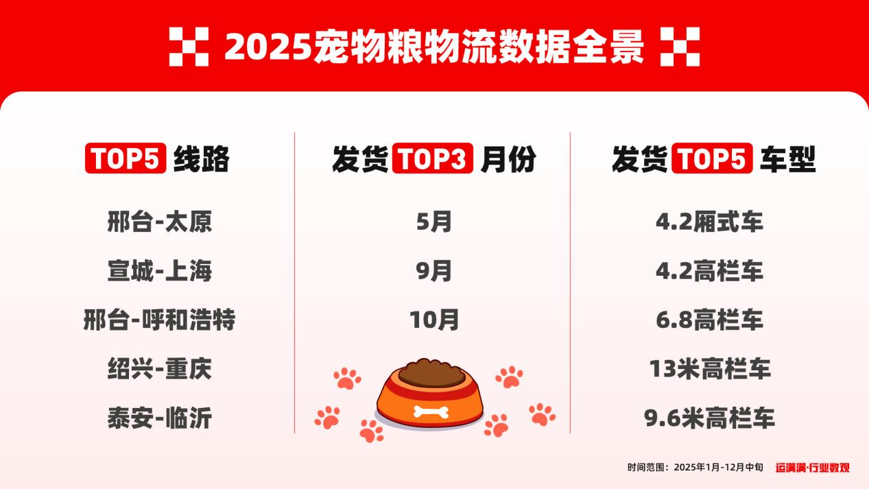2025年,“它经济”持续升温。在中国宠物经济持续扩容、消费结构加速升级的背景下,宠物食品行业正从“规模增长”迈向“结构分化”的新阶段。作为连接生产端与消费端的重要基础设施,物流数据正在成为观察这一行业变化的关键切口。2025年即将收官之际,数字货运平台运满满发布《2025宠物“干饭”物流图鉴》行业数观,基于平台宠物粮运输数据,从增长趋势、供需结构、线路车型、运输半径等多个维度,呈现宠物粮在中国市场的真实流动图谱,并深入河北南和宠物粮企业一线观察企业生产运输,让“行业数观”不止停留在纸面数据,而是落到真实的工厂与每一趟在路上的货车上。