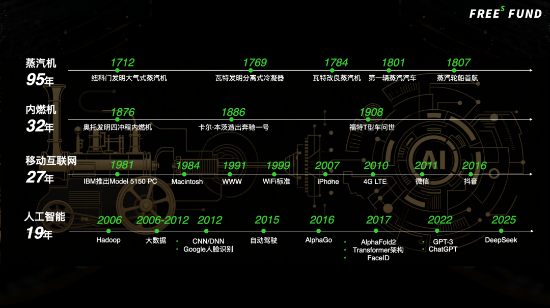 拿蒸汽机来说,从开始有蒸汽机,到改良普及,再到影响人类生产力,比如蒸汽汽车,蒸汽轮船的出现,大概花了100年。从奥托发明四冲程燃气内燃机,到卡尔本茨造出奔驰一号,也就是从有内燃机到它开始作为生产力工具,也花了30多年。