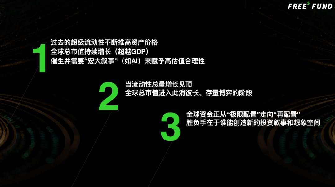 过去几年的超级流动性不断推高资产价格,全球总市值持续增长(超越GDP),催生并需要宏大叙事(AI)来赋予高估值合理性。