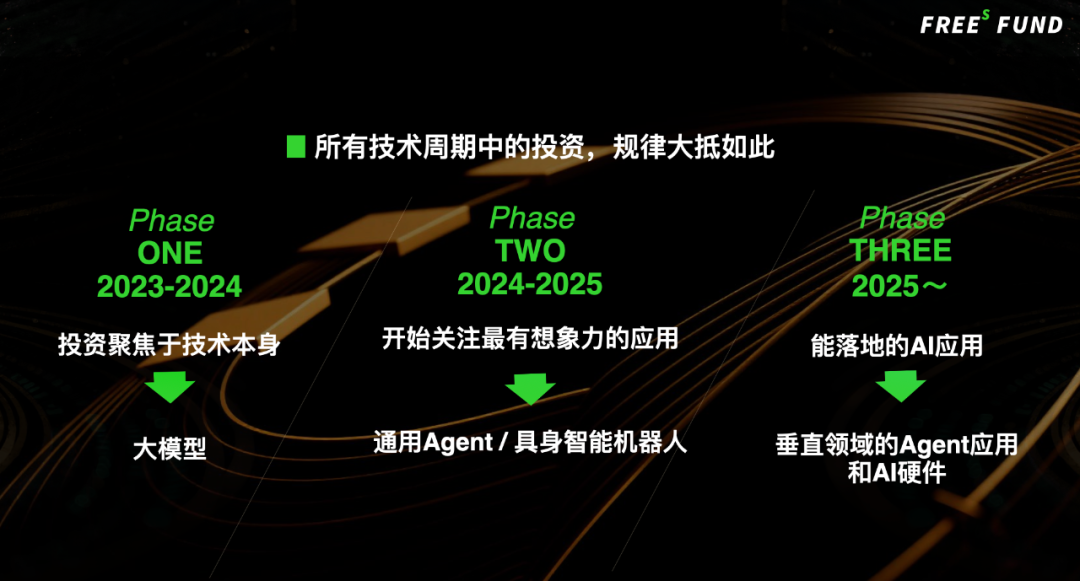 每一轮技术投资,都会经历这三个阶段,第一个阶段叫投资技术本身。第二个阶段叫做投最有想象力的应用,第三个阶段叫投能落地的应用。