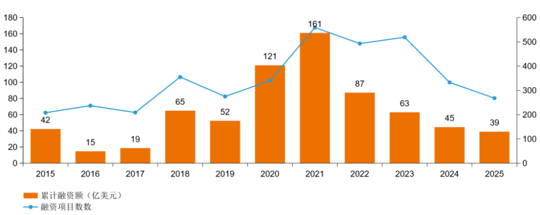 2015-2025年国内创新药及供应链领域总融资金额与融资事件数 数据来源:动脉智库