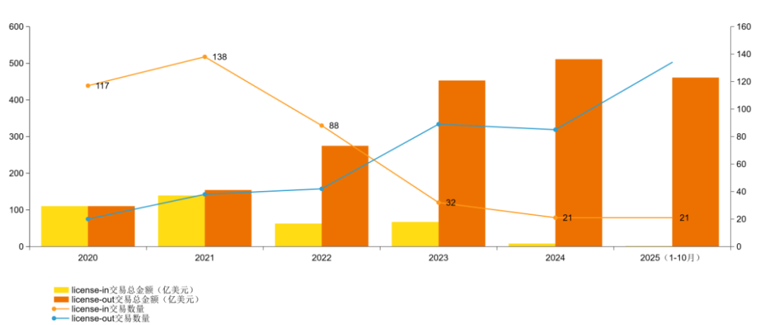 2020-2025年中国创新药license-in与license-out概况 数据来源:美柏必缔、动脉智库