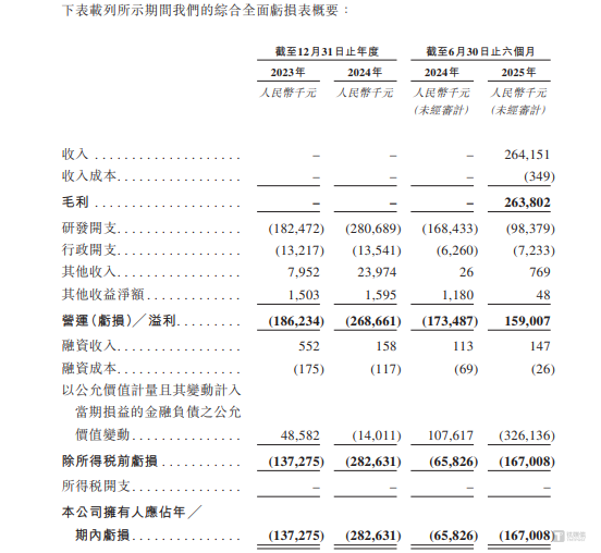 2023年-2024年和2025年1-6月(下称“报告期”),明宇制药分别实现营业收入0万元、0万元、26415.1万元,年内亏损分别为-13727.5万元、-28263.1万元、-16700.8万元,两年半合计亏损了近5.87亿元。需要说明的是,滨会生物上述2025年上半年实现的的收入主要是来与齐鲁的许可协议产生收入,并不涉及产品销售,公司目前无任何产品商业化。