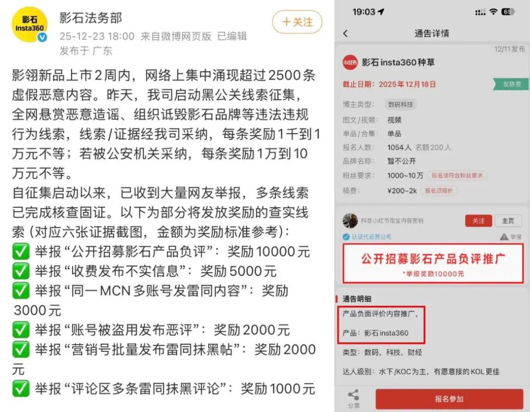 在某众包推广平台,一条以影石品牌名义发布的种草招募贴,发布一周内就超过1000人报名,稿费甚至高达2000一条,而在任务通告中,却明确要求创作者发布“产品负面评价内容推广”。