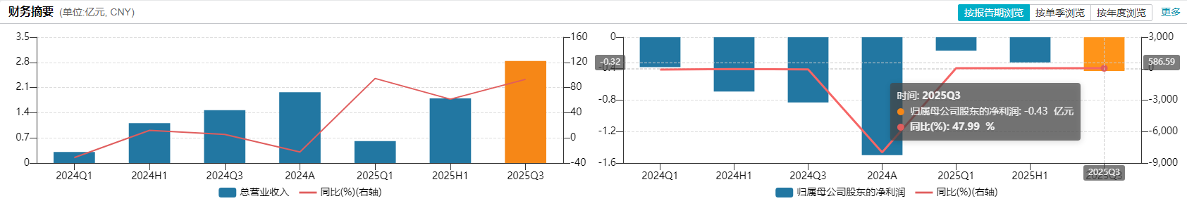 今年前三季度实现营业收入2.84亿元,同比大幅增长93.13%,接近3亿元的“退市红线”;归母净亏损从2024年的8309.48万元大幅收窄至4321.67万元,期末净资产(所有者权益合计)已从-3886.62万元转正至5879.66万元。