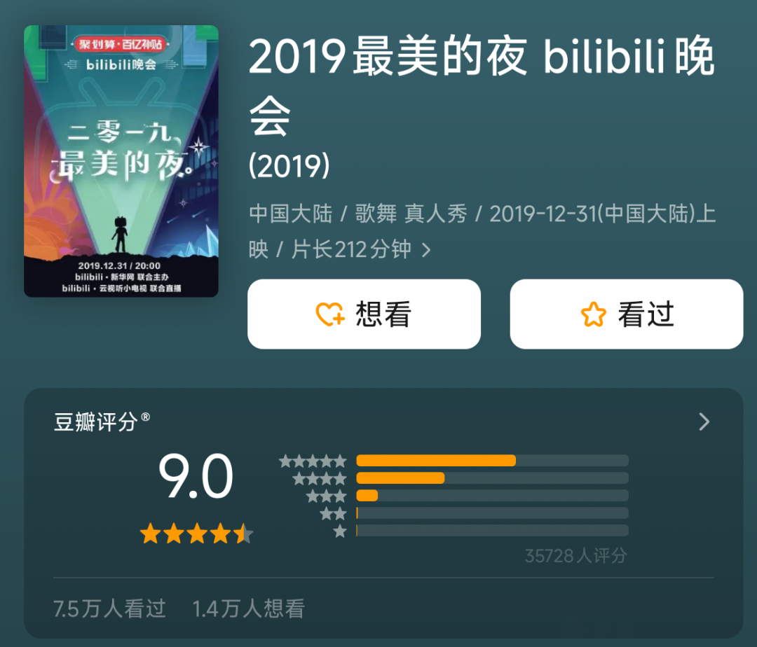 雷同的线上拼盘演唱会陷入疲劳期时,更年轻形态的跨年晚会开始崛起。2019年,B站举办了站内第一届跨年晚会“最美的夜”,同时在线人数超过8000万,晚会贴近平台原生的内容生态,突出情怀、复古、玩梗等元素,豆瓣评分高达9.0分,被媒体评价为“最懂年轻人的晚会”。