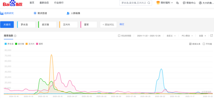 百度指数显示,罗永浩年内最高热度为47000,远超李佳琦和董宇辉。实际上,2025年,各路风流人物尽数登场,前有梁文锋和王兴兴,后有雷军,罗永浩的最高热度仅次于王兴兴,却超过了梁文锋和雷军。