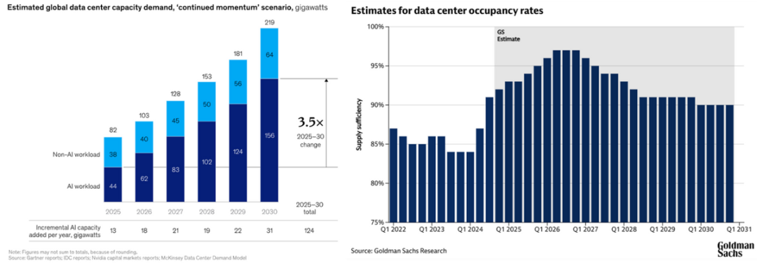 Gartner、IDC等预期2025~2030年5年间全球对数据中心算力的总需求会增加约1.7x,其中AI算力需求更是会增长2.5x。而高盛的估算数据中心的平均利用率在2022~24年初约为85%,但在25~28年间会有一个明显的波峰、最高可超95%。