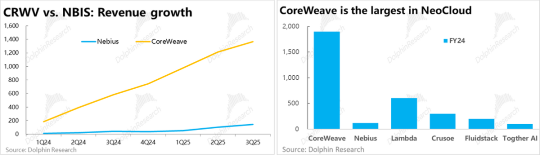 下图可见,截至24年营收近$20亿的CoreWeave断崖领先于同行普遍仅数亿的营收规模。在25年前三季度,CoreWeave的体量也仍相当于Nebius的 9~10x。