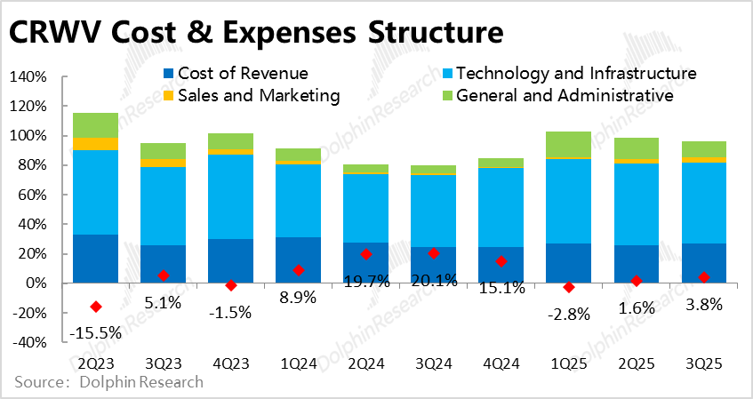c. 按常规口径对公司的成本和费用重新划分,CoreWeave真实成本率24财年约75%(原成本 T&I费用扣除其中的R&D部分),而传统三项经营费用(S&M,R&D,G&A)则合计占收入的10%~11%左右。