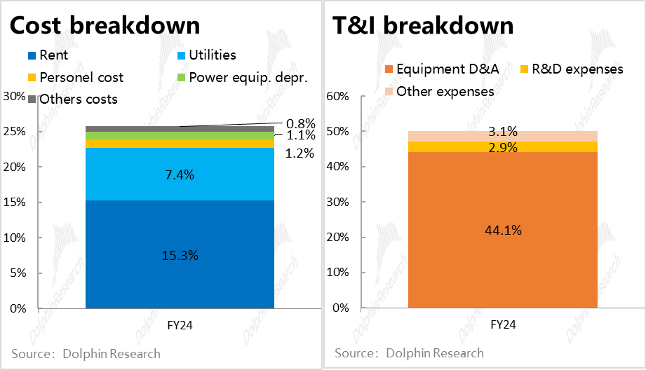a. 软硬件折旧(归在T&I内)是最大单一项,此一项就占24年总收入的约44%。清晰体现出,重资产生意购置IT设备、IT设备(主要是GPU)采购价格高,对公司盈利能力的明显压制。