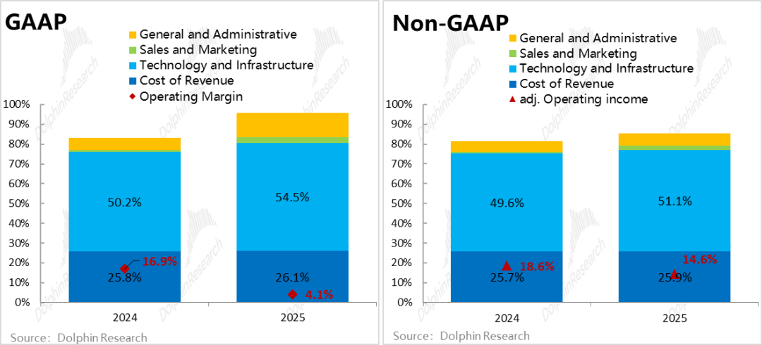a.公司的经营利润率不高,GAAP口径下25年以来仅在盈亏平衡上下徘徊(-5%~5%)。剔除股权激励的Non-GAAP经营利润率则在15%以上,但股权激励是不该被直接忽视的持续性支出。