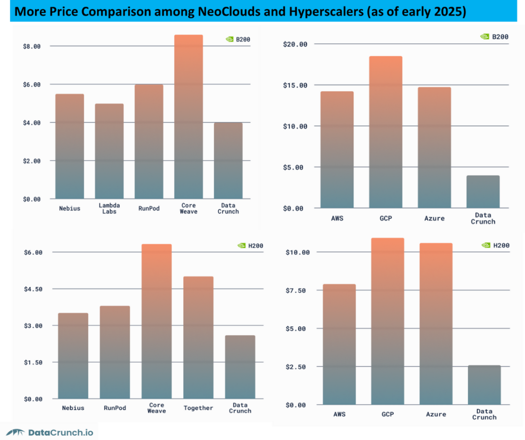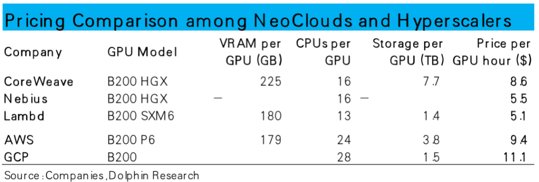 a. 定价:首先,影响盈利能力的第一要素就是对产品的不同定价能力。对类似的单个B200 GPU的定价,可以看到云巨头的定价($9 ~ $11/h)普遍高于新云($5 ~ $8/h)。在运营成本类似的情况下,新云的利润率就是会低于巨头们。