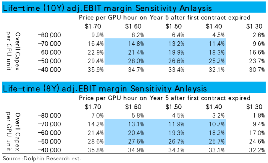 这作为后续估值时,判断公司长期稳态利润率的基准。根据不同的合同到期后算力定价,和前置Capex投入多少,公司adj.EBIT利润率的敏感性区间在10%~28%左右。