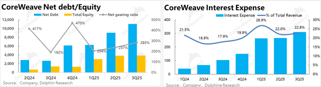 这种高负债高杠杆的模式,一方面允许了CoreWeave无需过多依靠自身资本金也能快速发展业务;但另一面,高杠杆和高负载也让本就不高的经营利润率,还要再被利息支出侵蚀一大部分,也带来了资不抵债股东权益归零的风险。
