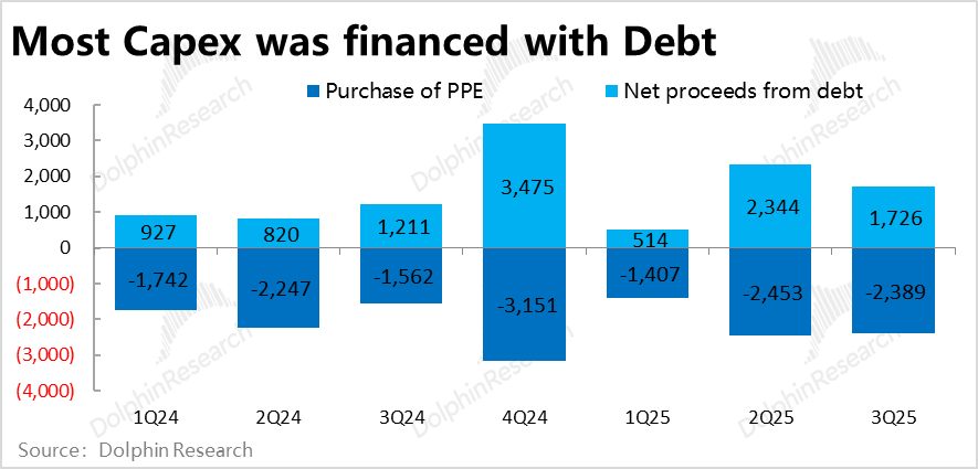 b. 现金流量表上,近2年来公司购买资产&设备的现金支出,和当季债务融资金额大体相当;