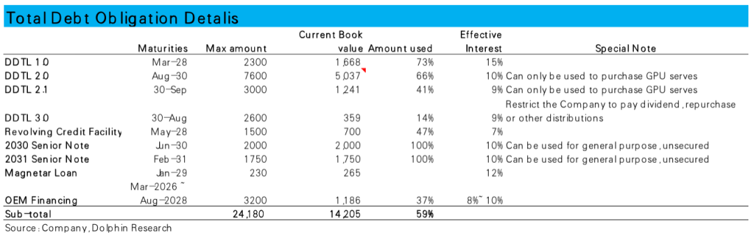 b. 当前各项负债的实际利率普遍都在10%上下,相比巨头公司甚至低于美国国债的融资利率,CoreWeave这类“小公司”融资成本肉眼可见的高。