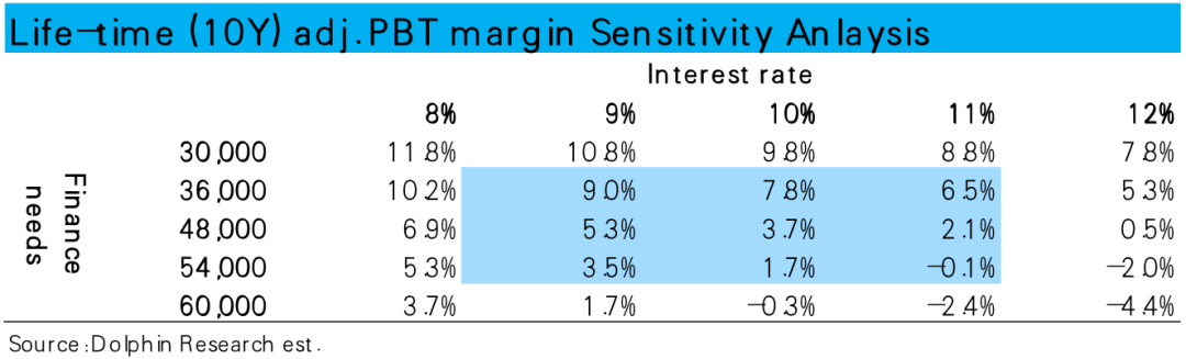 对应对60,00Capex下的adj.EBIT利润率(约20%),利息产生约的拖累在11%~20%。