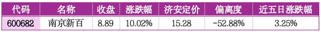 机会提示:南京新百偏离济安定价-52.88%,低估值优势突出,叠加生物医疗行业需求提升及大健康产业协同效应释放,旗下核心医疗产品国内上市进程推进,养老业务市场空间拓展,估值修复空间明确。