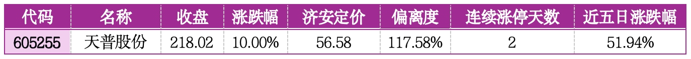 风险提示:天普股份偏离济安定价117.58%,估值泡沫极度严重,股价纯依赖资金短期炒作,无核心业绩及产业逻辑支撑,两连板后获利盘兑现压力巨大,回调风险极高,需坚决规避。