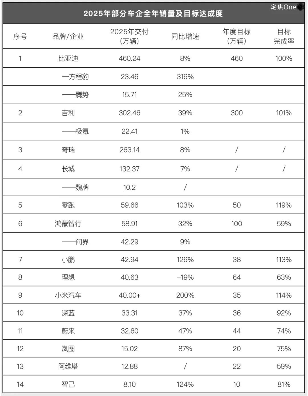 比亚迪以460万辆的绝对优势一骑绝尘,吉利突破300万辆大关,奇瑞达到263万辆,长城交付132万辆。
