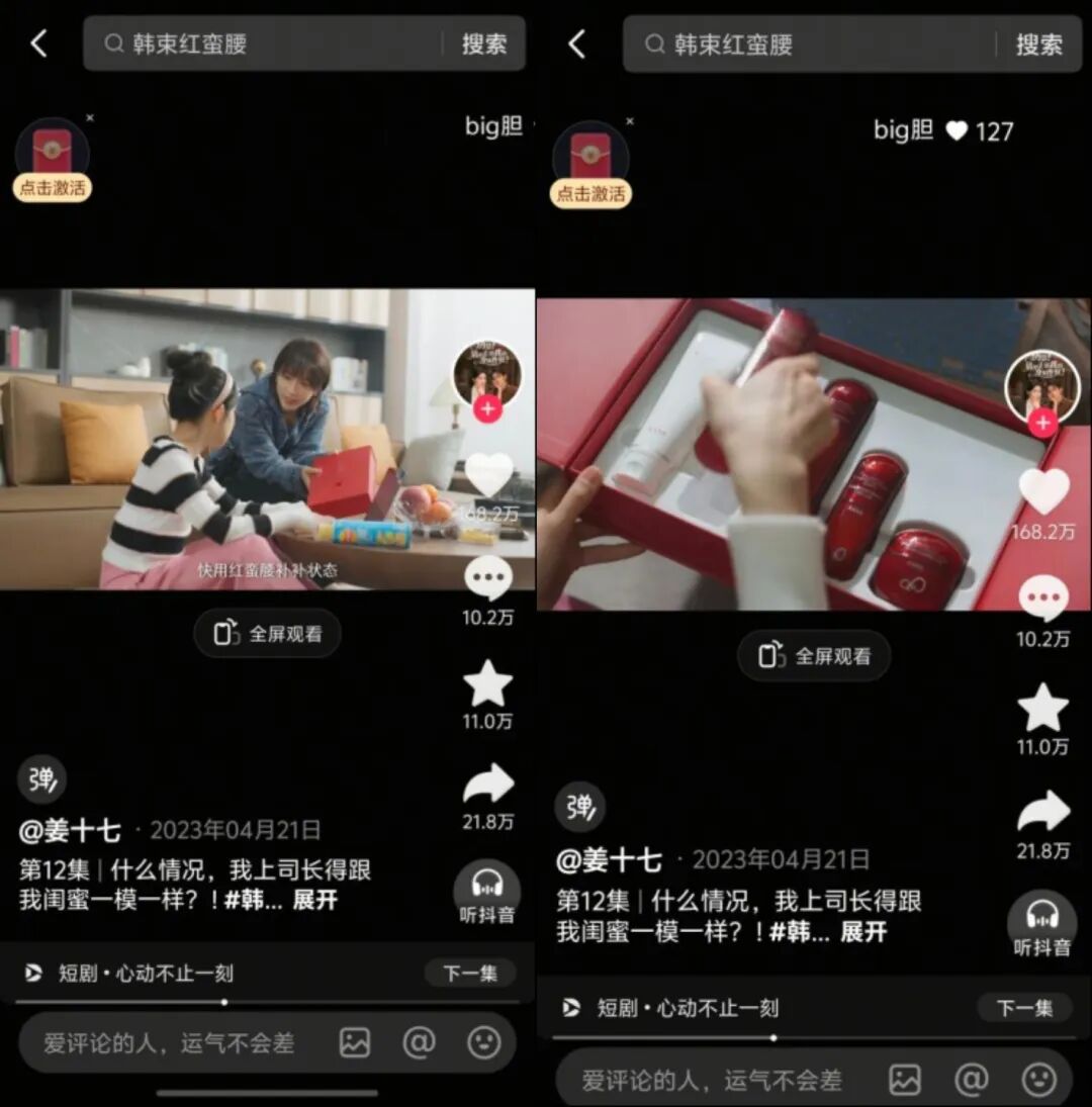 进入抖音早期,韩束并未把重心放在官方账号,而是率先把短剧引入为核心引流工具。短剧不承担品牌叙事功能,剧情负责完播率,产品在关键节点出现,直接完成从内容到交易的跳转。例如,心动不止一刻的短剧里,女主因状态不佳,朋友送上一盒红蛮腰,剧情简单,效果直观。