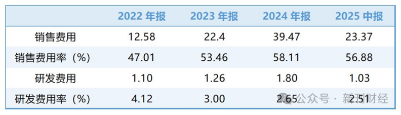 然而,这种模式的背后,暴露出一个严重问题——营销费用大幅攀升。同花顺数据显示,2022至2025年上半年,销售费用率从47%升至58.11%,今年上半年,销售费用已是研发费用的20倍。