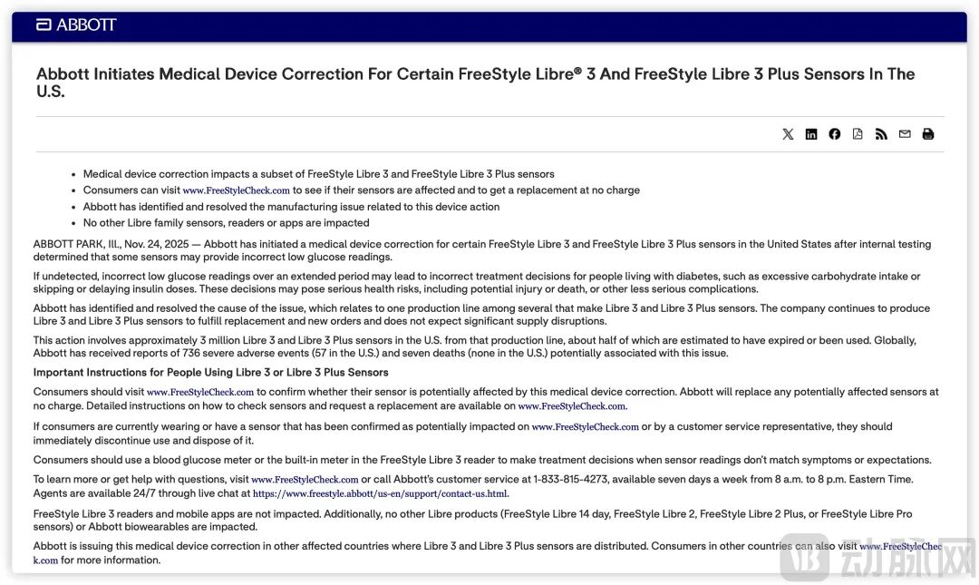 然而就在11月底,雅培针对部分FreeStyle Libre 3及Libre 3 Plus传感器发布了医疗器械修正公告,原因是特定生产线的产品存在潜在缺陷,可能会导致显示错误的低血糖数据,若患者根据错误读数调整药物或胰岛素剂量,将会引发严重低血糖事件,包括昏迷、器官损伤甚至死亡,此次行动基于全球736起严重不良事件报告包括7例死亡事件。