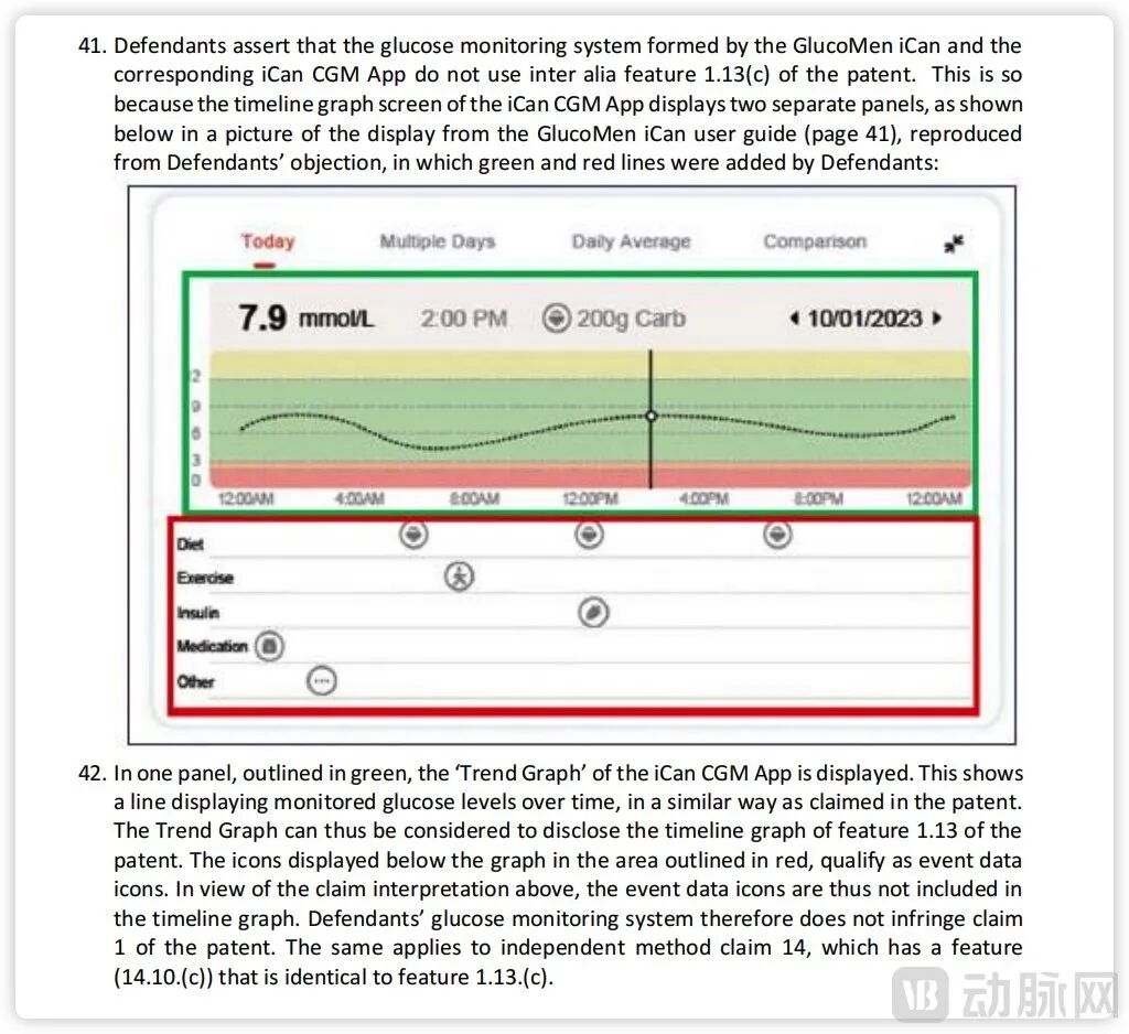 被UPC驳回禁令要求的EP3988471专利,是一项保护医疗设备显示的时间线图界面技术的专利,核心在于保护app界面布局的具体细节。据UPC文件披露,此次驳回的理由主要基于三诺CGM产品配套app中的显示界面并未落入雅培专利权利要求的保护范围,故不构成侵权。这份判决体现了UPC通过严格的权利要求书去确定专利保护范围,并基于此去判定产品是否落入该范围的裁判思路。