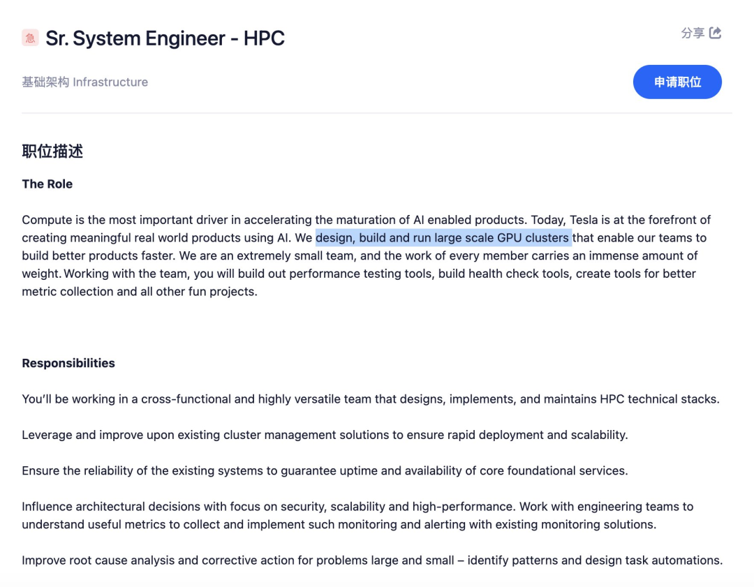 特斯拉中国突然刊登了一则“高级HPC系统工程师”的招聘启事。这个职位工作地点在上海,它的职责是要建设并维护下一代特斯拉数据中心。