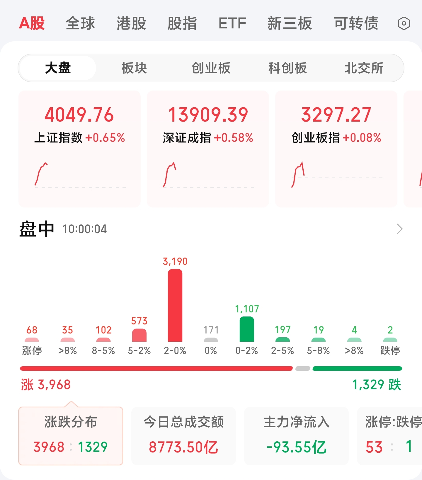 市场交易也非常活跃。Wind数据显示,沪深京三市全天成交额达25672亿元,较上一交易日大幅放量5015亿元。当日,全市场飘红个股超4100只,普涨行情形成明显的赚钱效应。